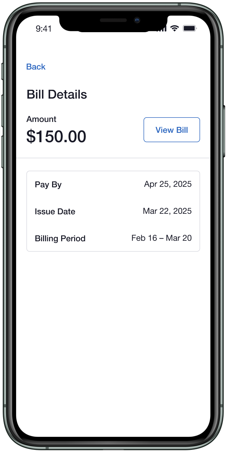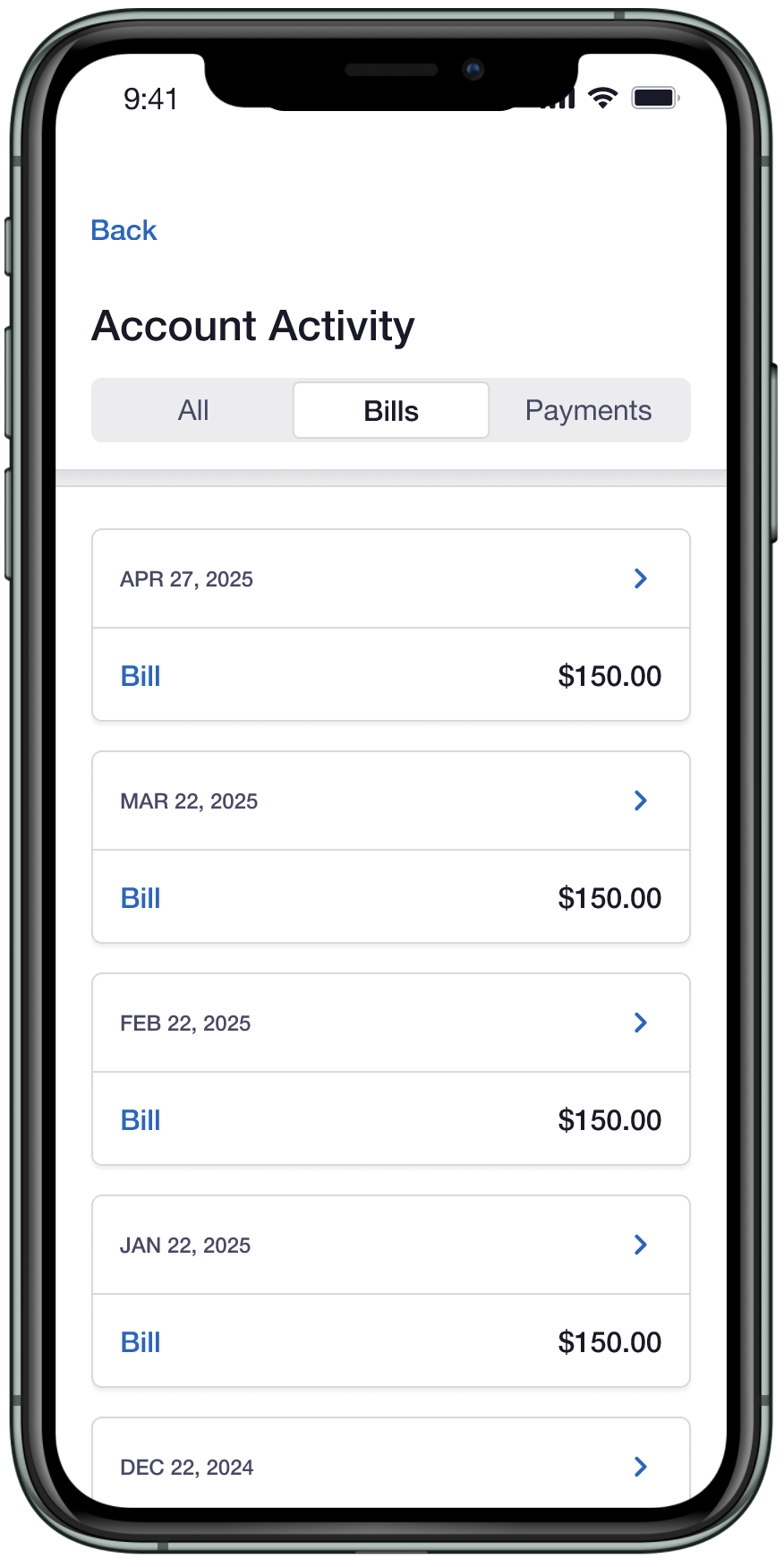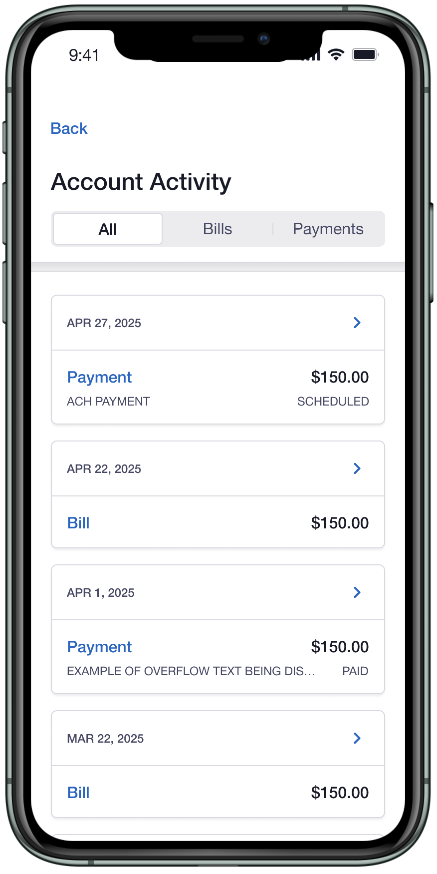 Explored hierarchy and information display within bill and payment detail views.