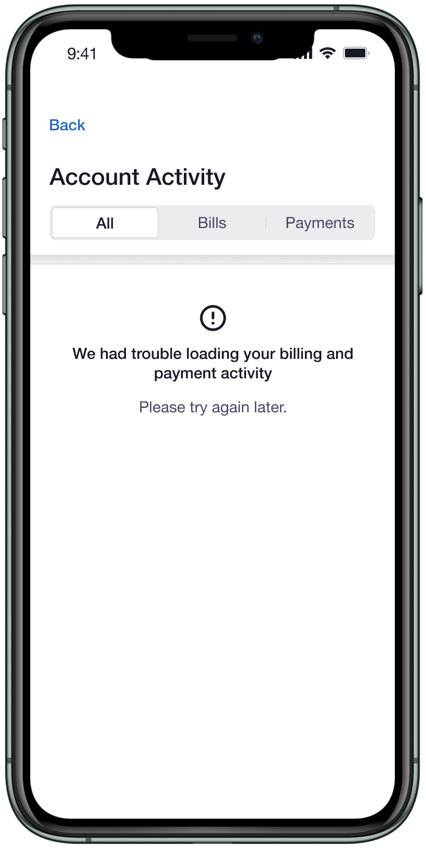 User: Jamie wants to review their payment and bill activity but there is an error loading payment entries.