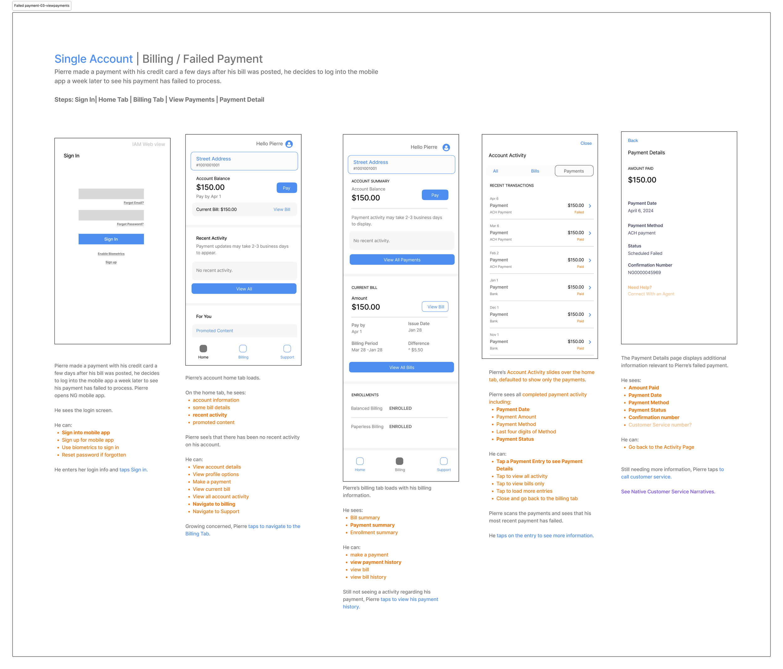 Before any screens, we worked through narratives with product and engineering to validate edge cases and prioritize user needs. Key decisions included things like whether to show canceled and rebilled bills side by side, how to handle partial data failures, and what 24 months of history actually looks like across different account types. Below are a few narratives that we brainstormed.